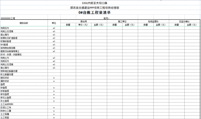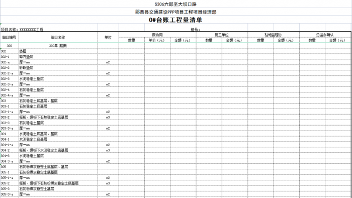 一個項目或一個合同段的臺賬由n條可以獨立計量的工程結(jié)構(gòu)(單元)組成,一般情況下一條臺賬應(yīng)包含子目號、子目名稱、單位、工程數(shù)量、單價、合價、里程樁號、工程部位描述、圖紙編號、備注說明等。